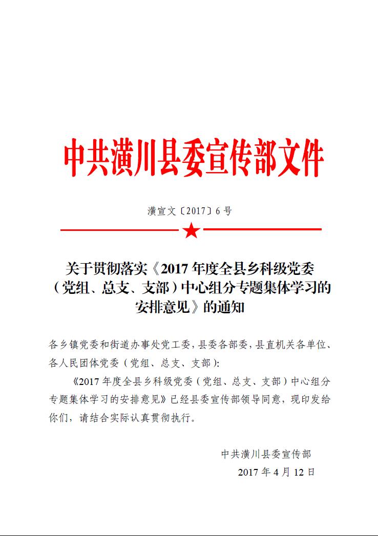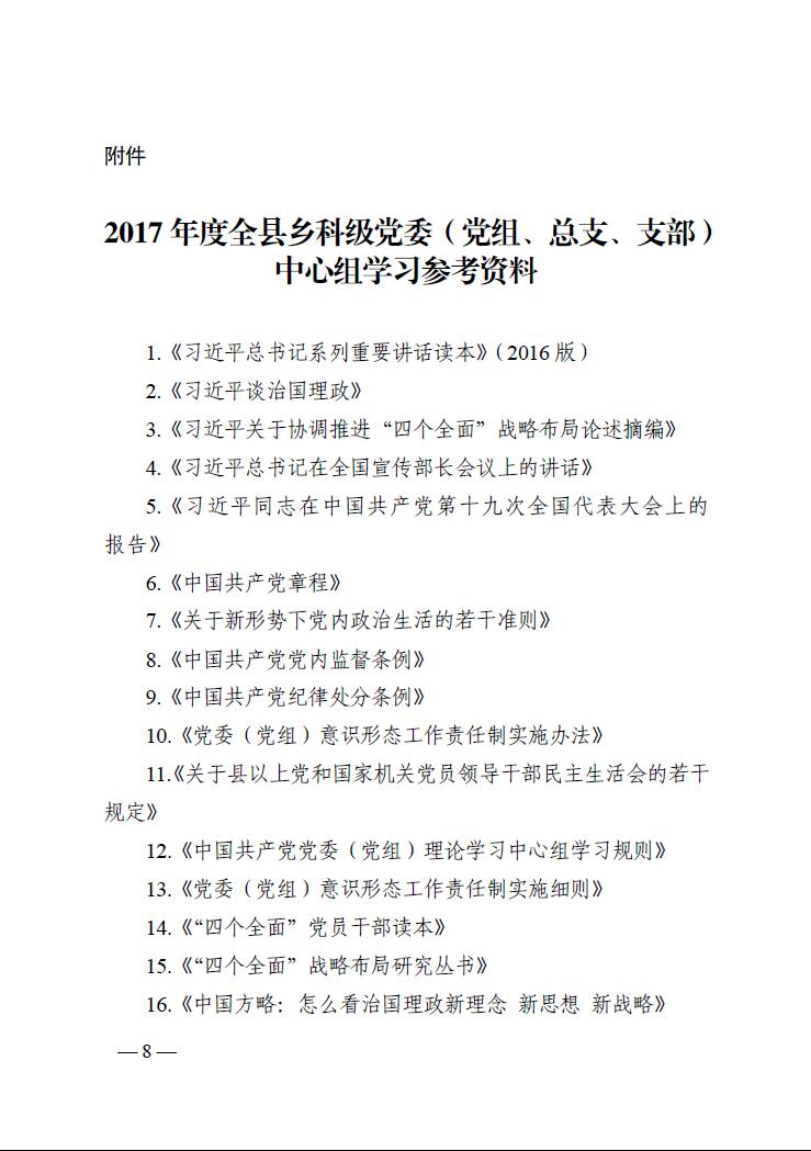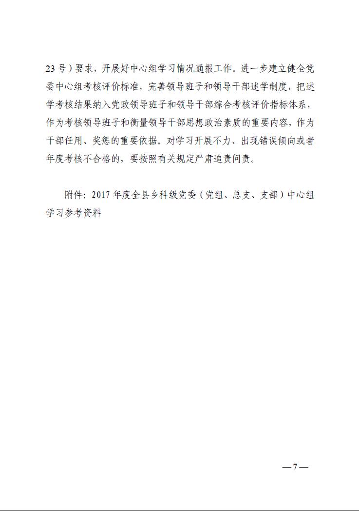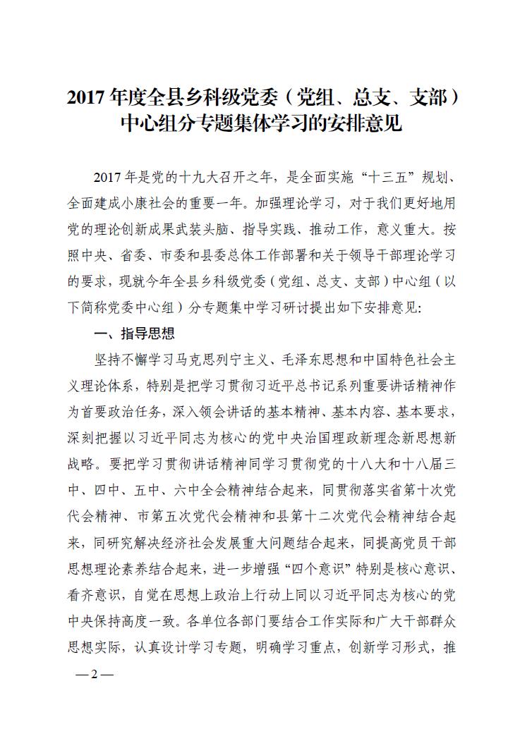 关于贯彻落实《2017年度全县乡科级党委(党组、总支、支部)中心组分专题集体学习的 安排意见》的通知