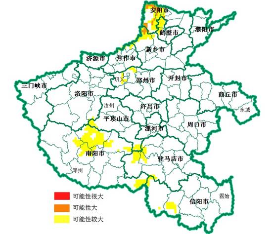 今晚到明天,河南省地质灾害预警预报达到橙色预警的地区为:新乡地区北部、安阳地区西部,发生地质灾害的可能性大。地质灾害预警预报达到黄色预警的地区为:安阳、鹤壁、新乡、焦作、郑州、洛阳、平顶山、驻马店、南阳、信阳地区及巩义东部,发生地质灾害的可能性较大。