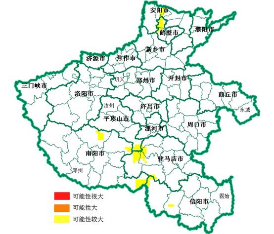 今晚到明天,河南省地质灾害预警预报达到黄色预警的地区为:安阳地区、鹤壁地区、平顶山地区、驻马店地区、南阳地区、信阳地区局部,发生地质灾害的可能性较大。