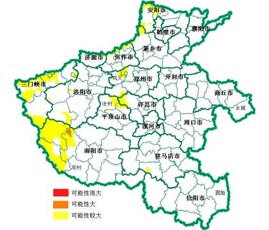 今晚到明天,河南省地质灾害预警预报达到橙色预警的地区为:南阳地区北部局部,发生地质灾害的可能性大。地质灾害预警预报达到黄色预警的地区为:三门峡、南阳大部,安阳、郑州、许昌、洛阳地区西部,新乡西北部,焦作北部及南部,济源、平顶山北部,驻马店南部,巩义、汝州东部,发生地质灾害的可能性较大。
