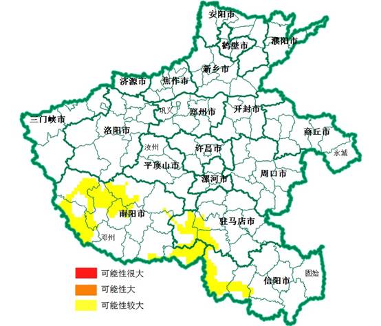 今晚到明天,河南省地质灾害预警预报达到黄色预警的地区为:南阳地区西部及东部局部,驻马店、信阳地区西部,洛阳地区南部局部,发生地质灾害的可能性较大。