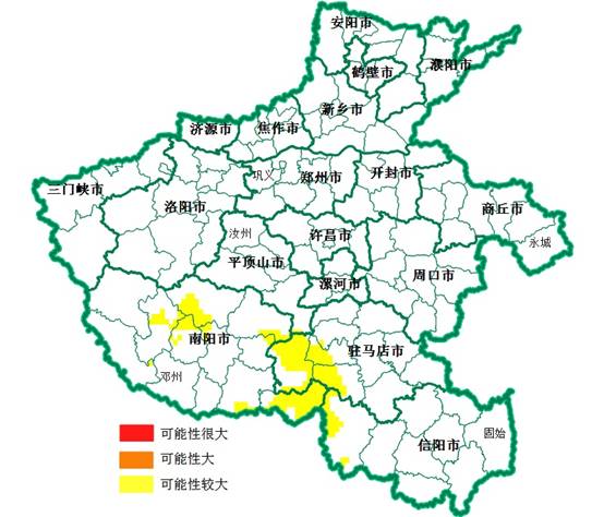 今晚到明天,河南省地质灾害预警预报达到黄色预警的地区为:驻马店、信阳地区西部,南阳地区局部,平顶山东南部局部,发生地质灾害的可能性较大。