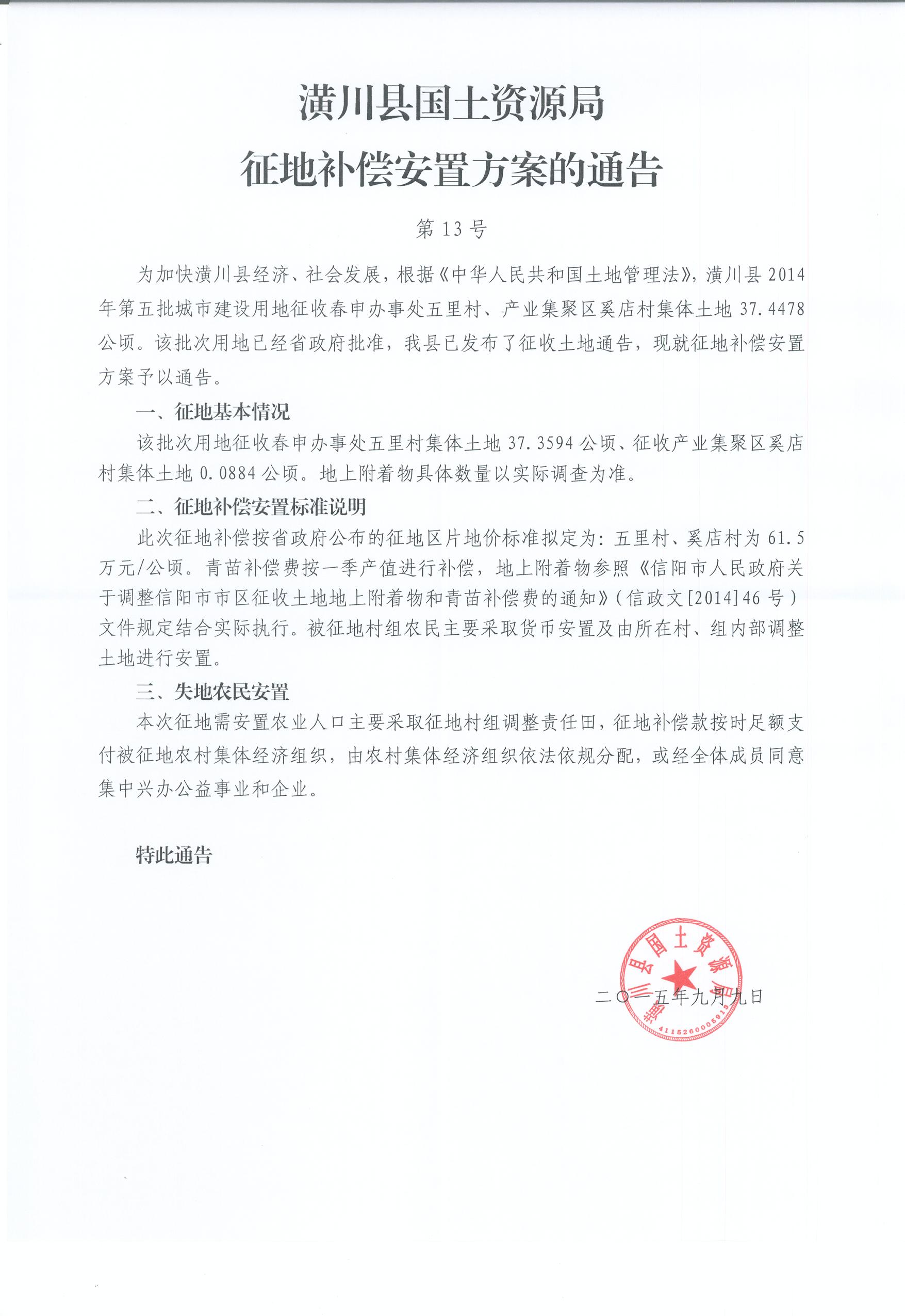潢川县2014年度第五批城市建设用地征地安置补偿方案公告