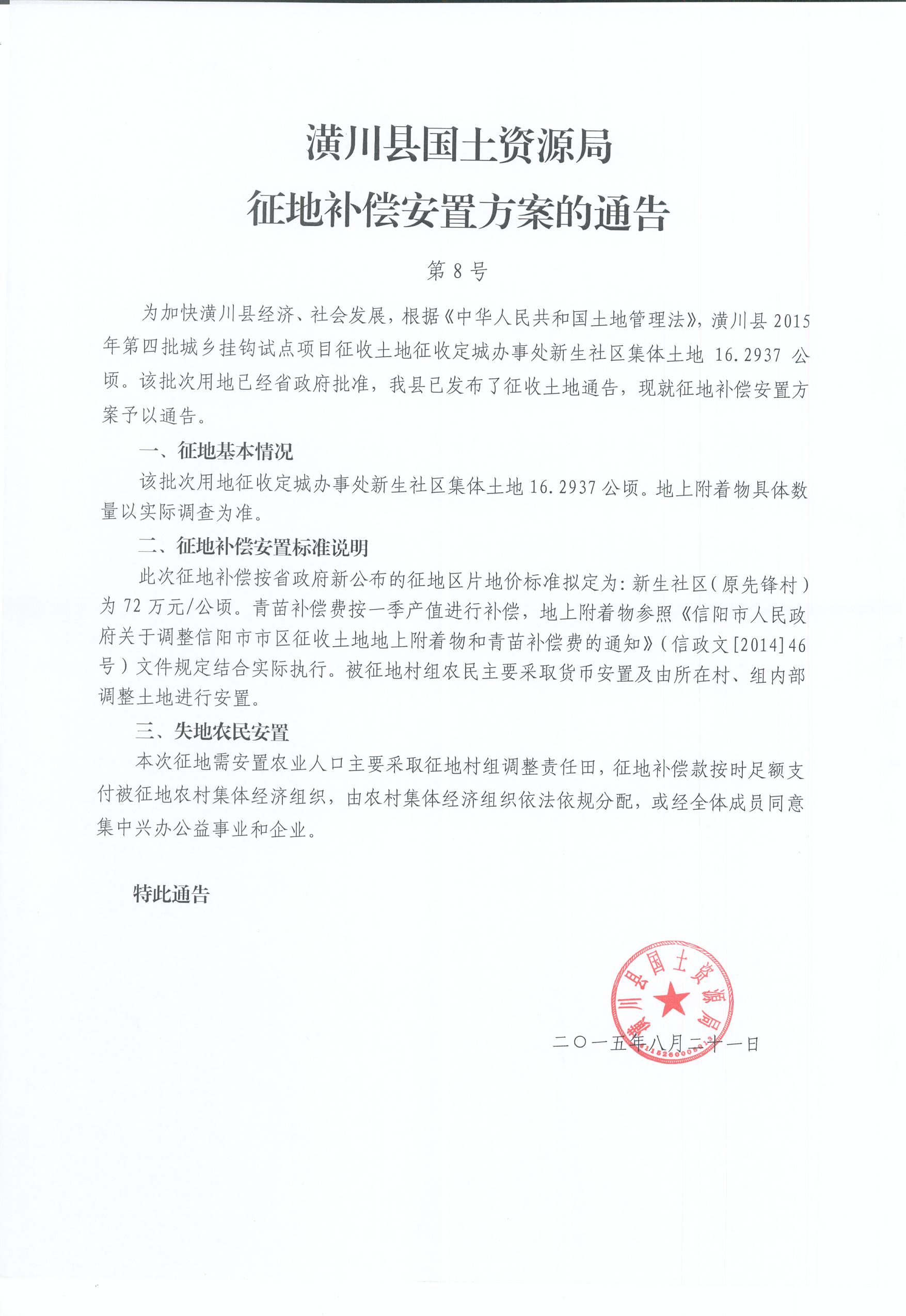潢川县2015年度第四批城乡挂钩征收征地安置补偿方案公告