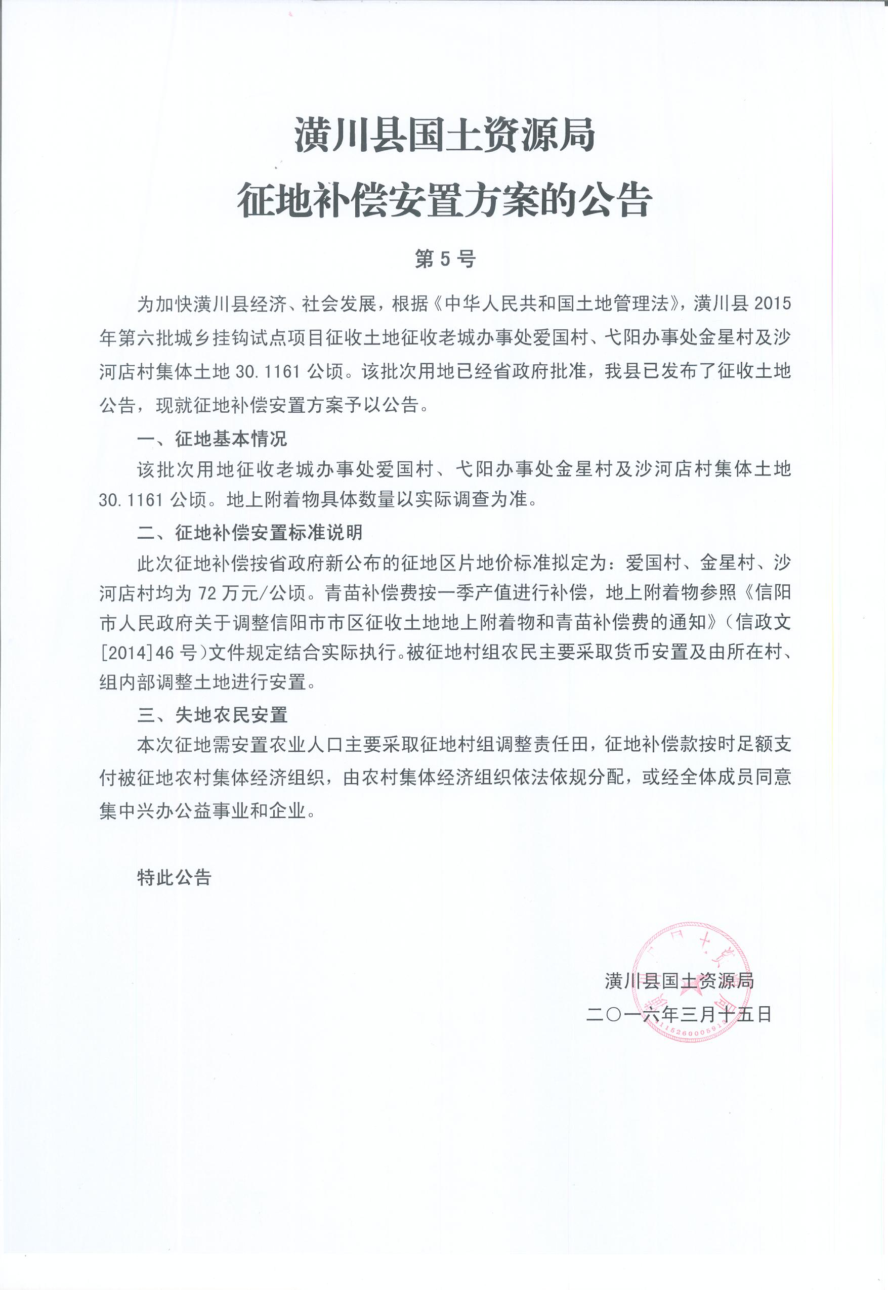潢川县2014年度第五批城市建设用地征地安置补偿方案公告