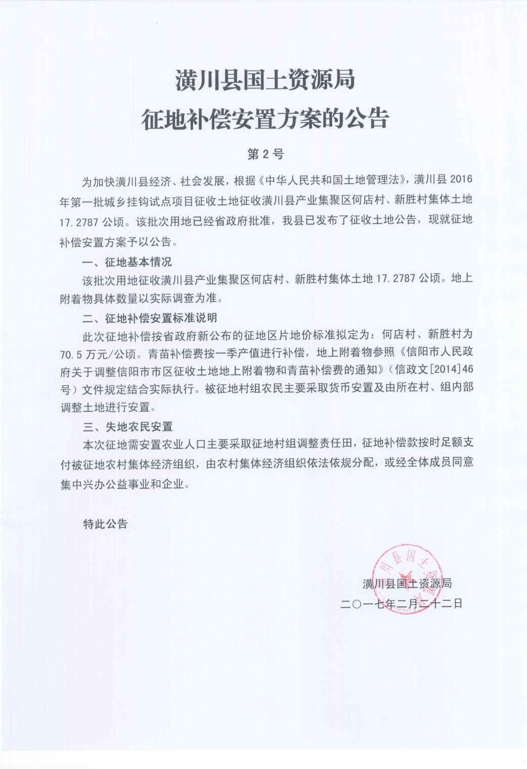 潢川县2016年度第一批城乡增减挂钩试点项目征收土地补偿安置公告
