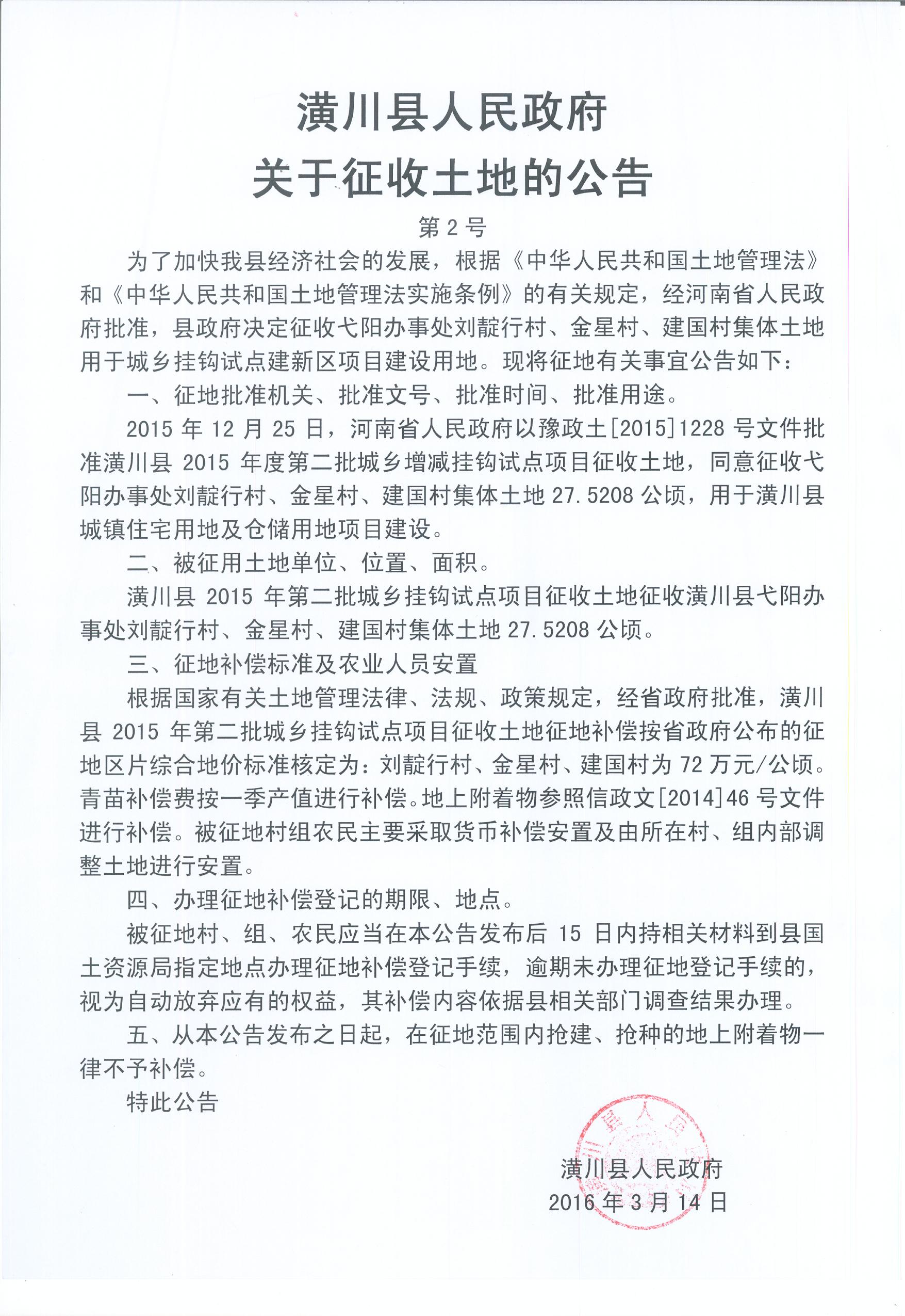 潢川县2015年度第一批城乡增减挂钩试点项目征收土地公告