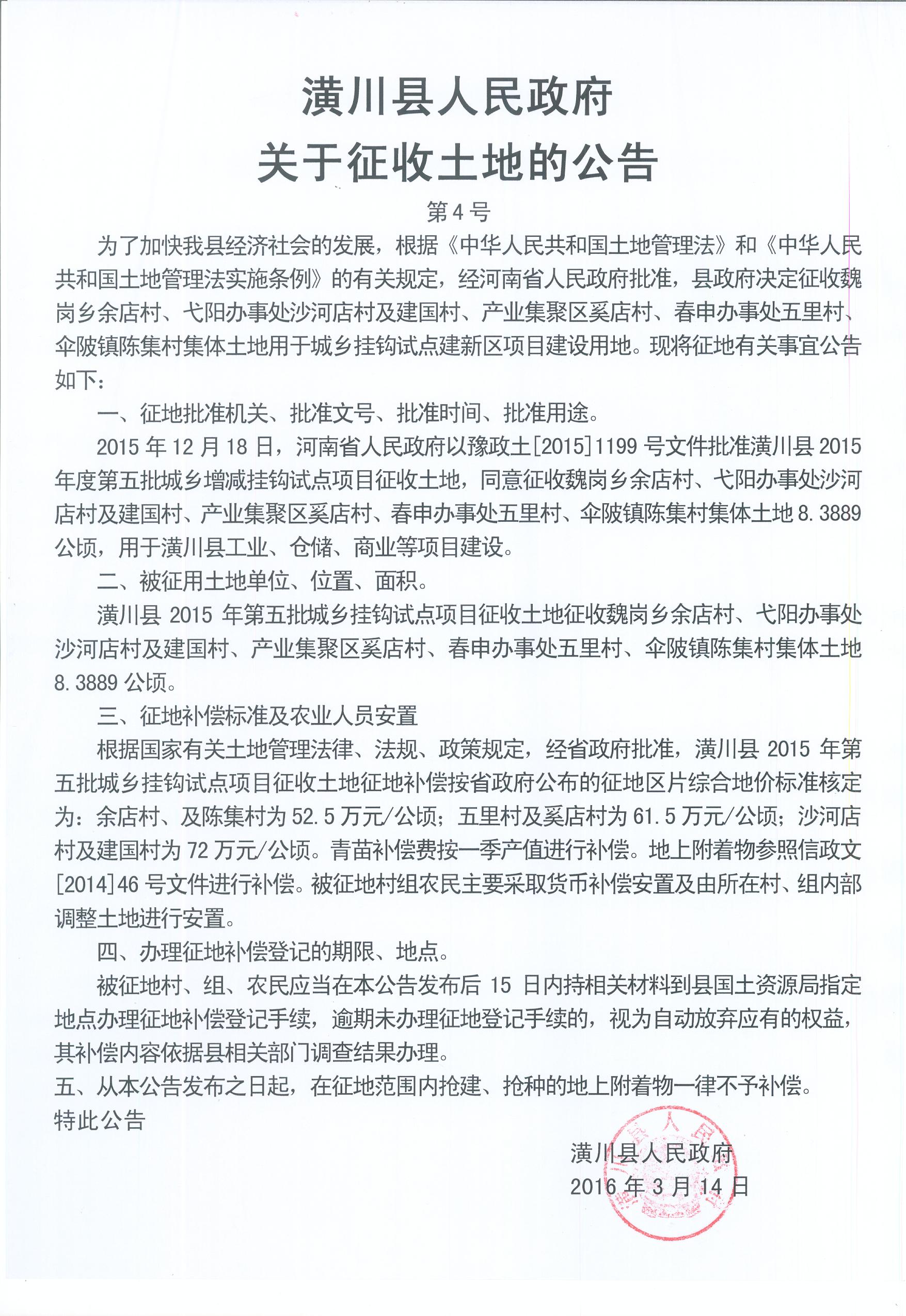 潢川县2015年度第一批城乡增减挂钩试点项目征收土地公告