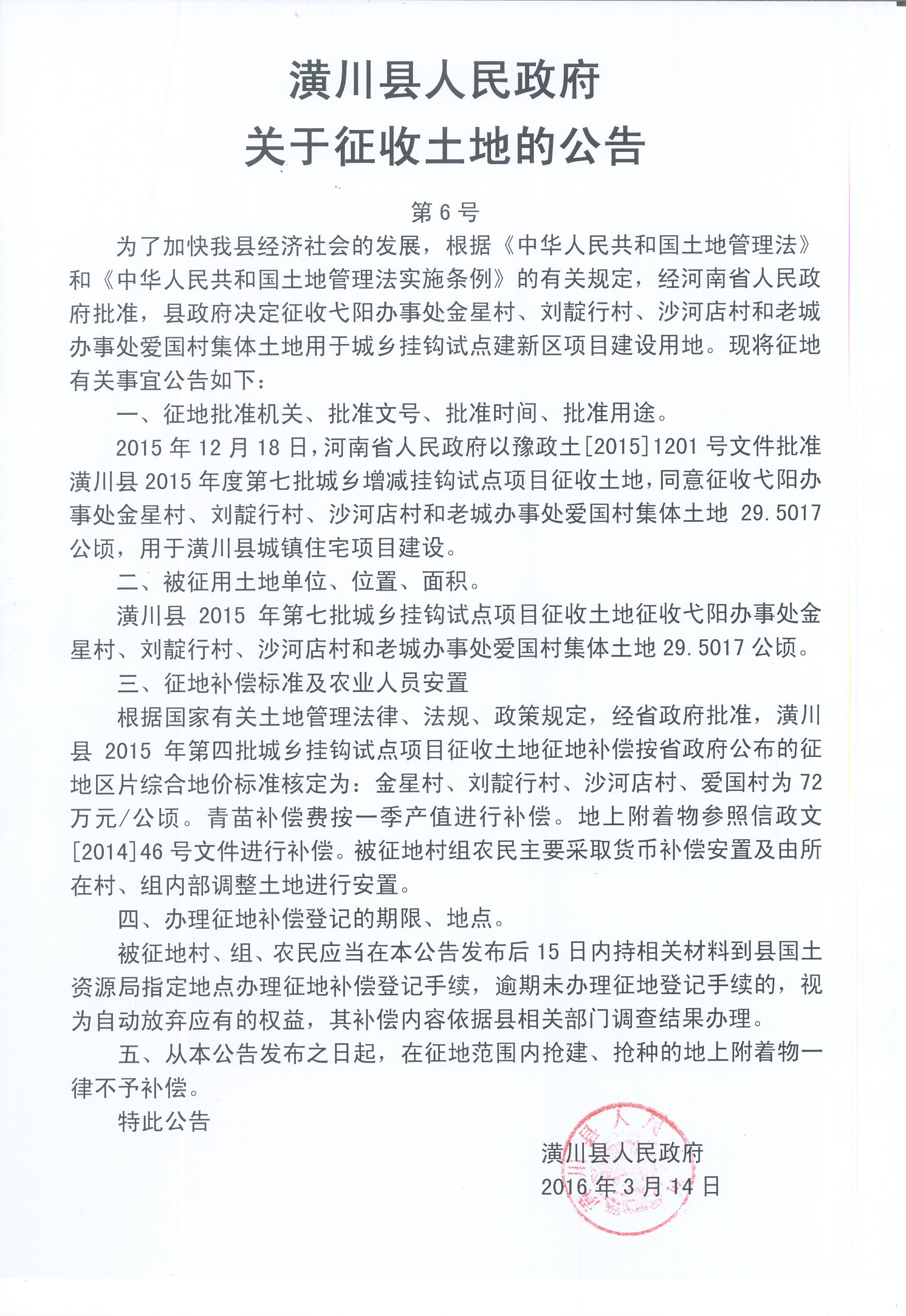潢川县2015年度第一批城乡增减挂钩试点项目征收土地公告