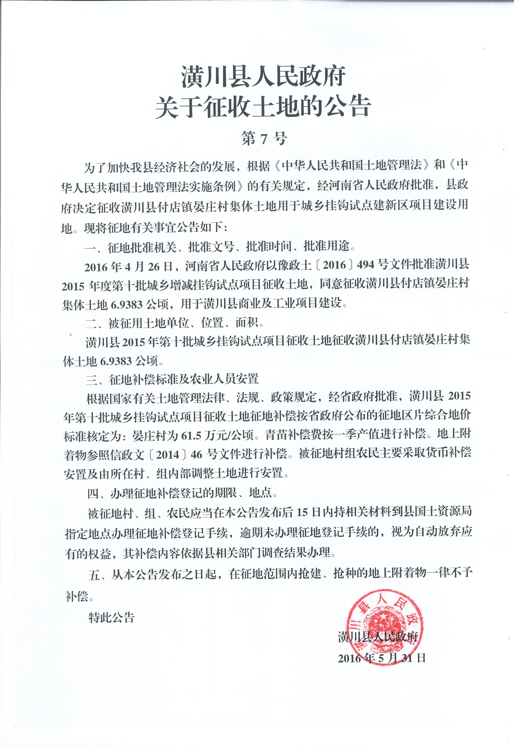 潢川县2015年度第一批城乡增减挂钩试点项目征收土地公告