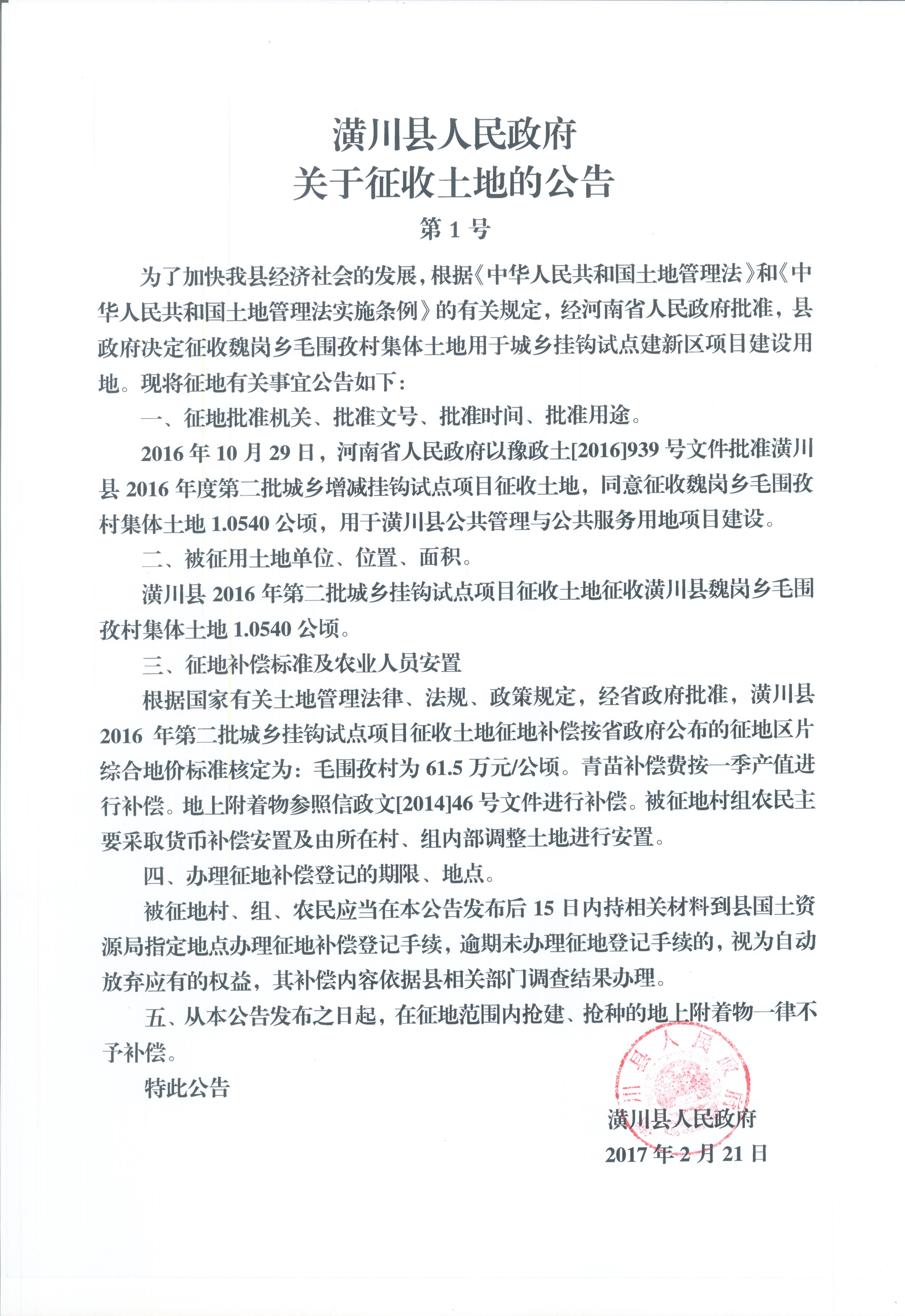 潢川县2016年度第二批城乡增减挂钩试点项目征地公告