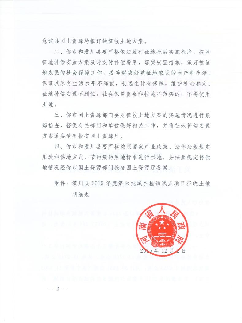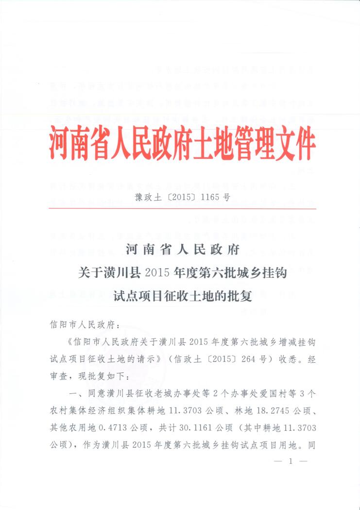 河南省人民政府关于潢川县2015年度第六批城乡挂钩试点项目征收土地的批复