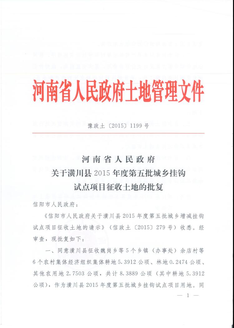 河南省人民政府关于潢川县2015年度第五批城乡挂钩试点项目征收土地的批复