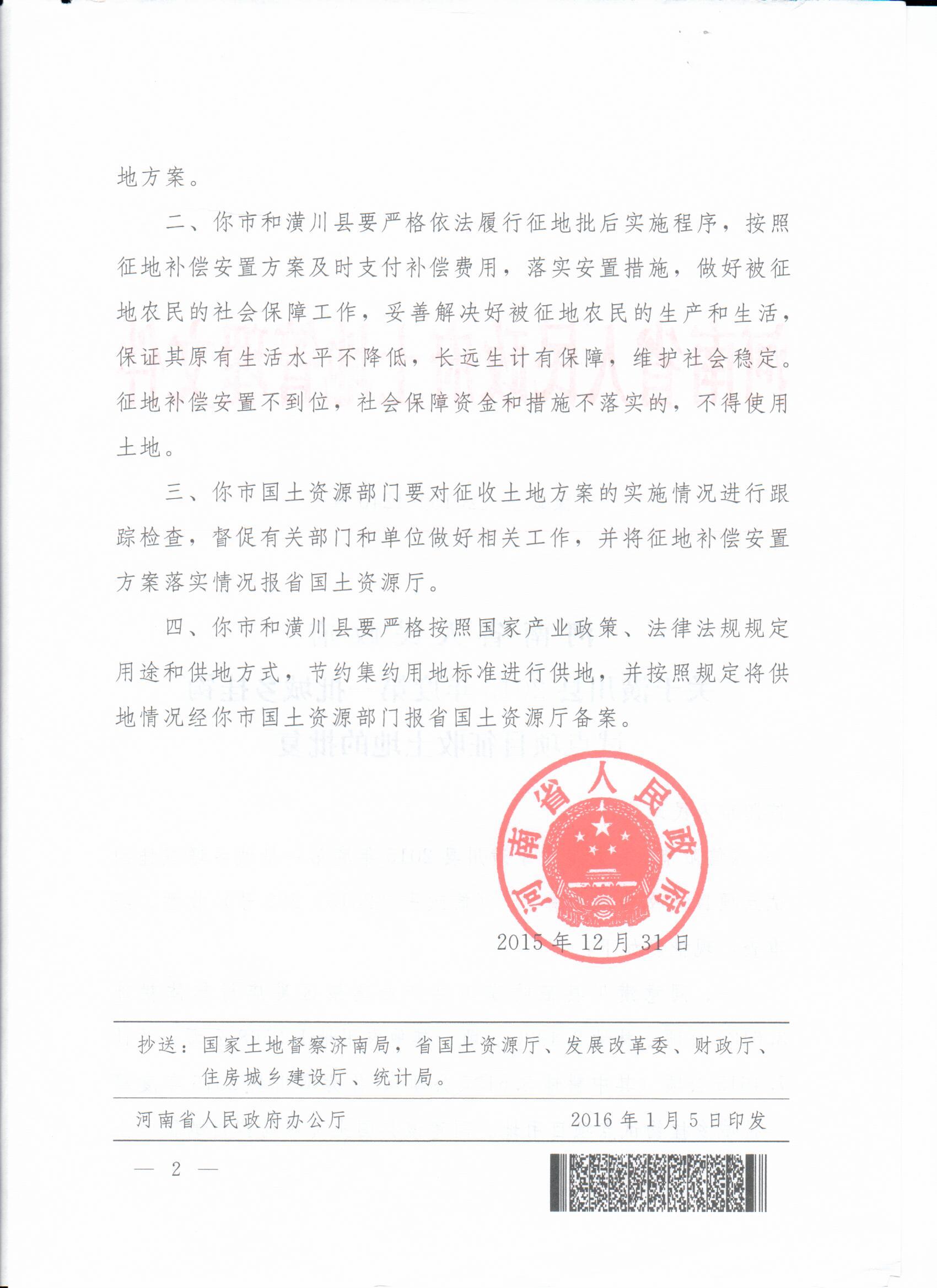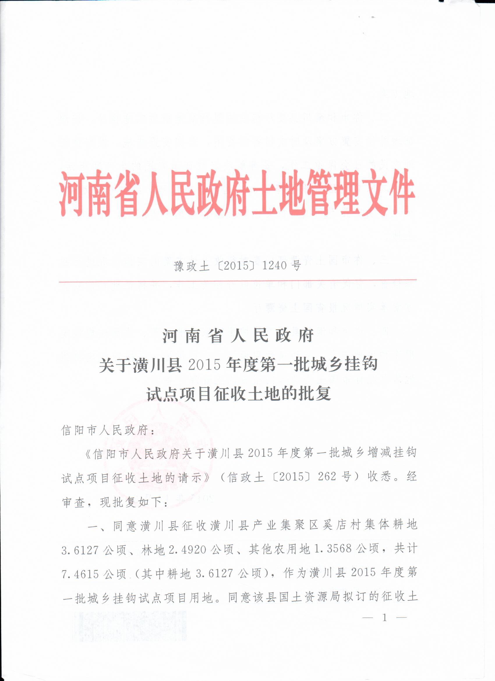 河南省人民政府关于潢川县2015年度第一批城乡挂钩试点项目征收土地的批复