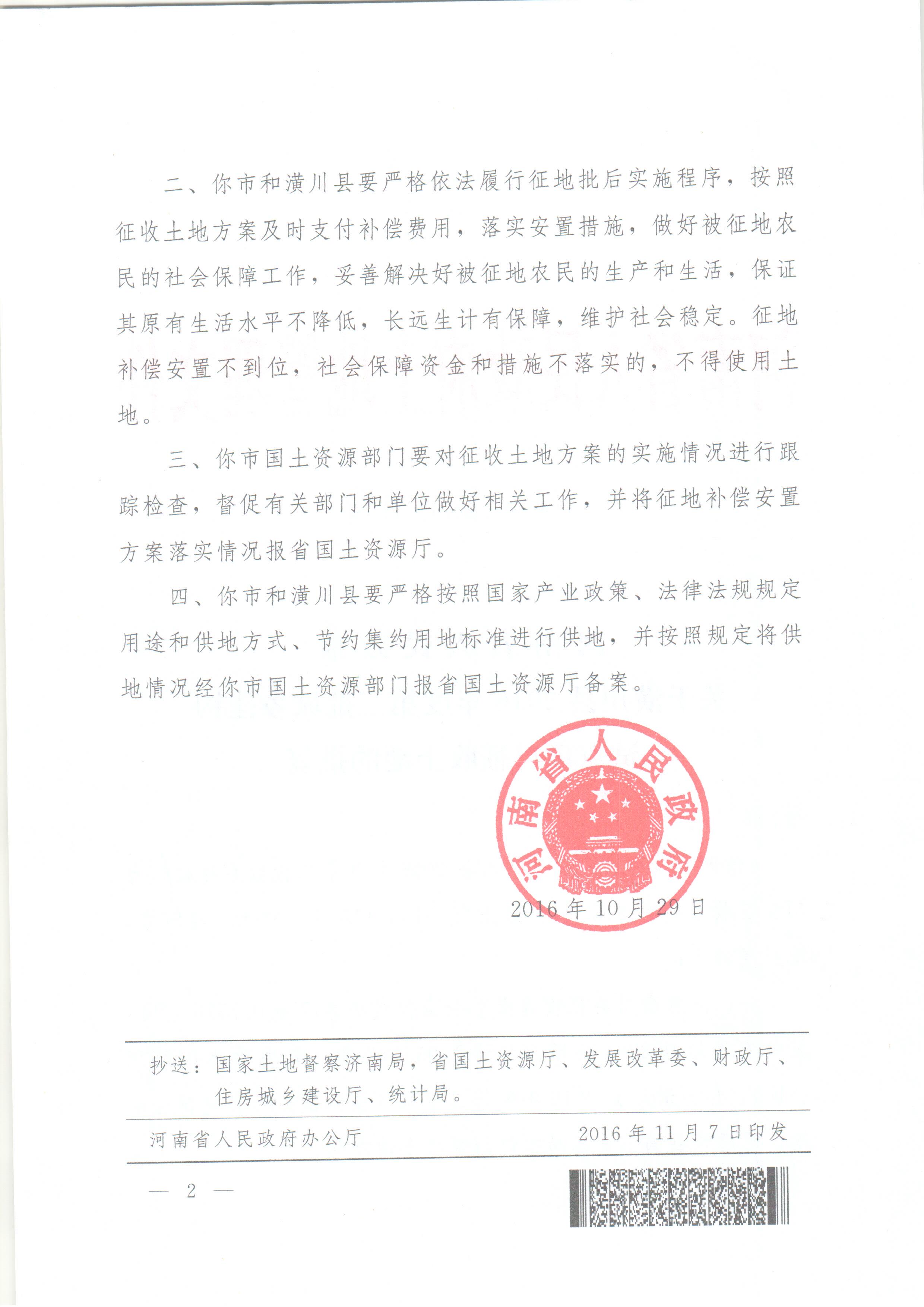 河南省人民政府关于潢川县2016年度第二批城乡挂钩试点项目征收土地的批复